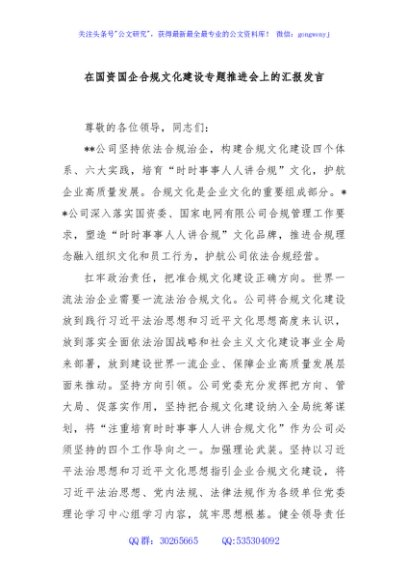/ 在国资国企合规文化建设专题推进会上的汇报发言