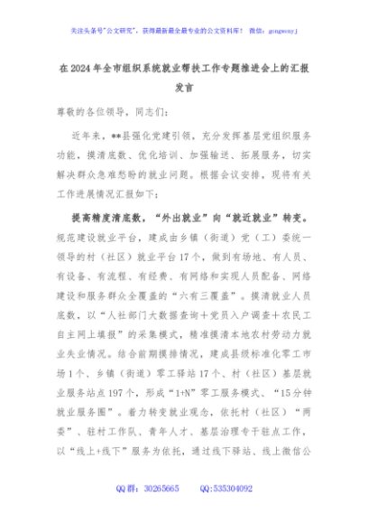 / 在2024年全市组织系统就业帮扶工作专题推进会上的汇报发言