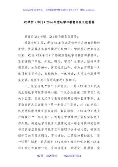 XX单位(部门)2024年党纪学习教育经验汇报材料