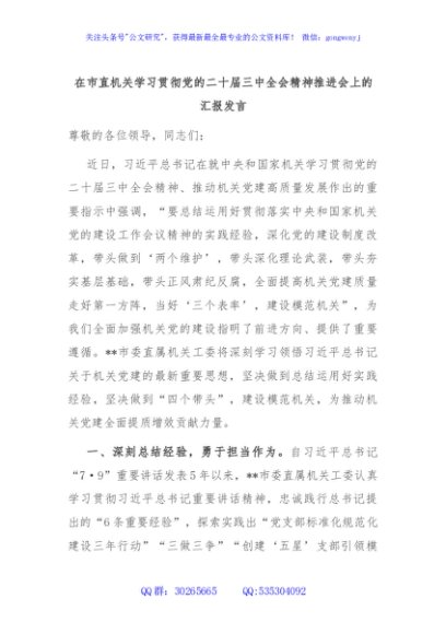 / 在市直机关学习贯彻党的二十届三中全会精神推进会上的汇报发言