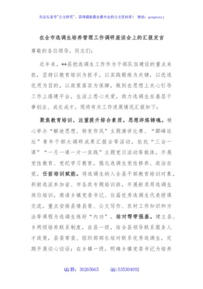 / 在全市选调生培养管理工作调研座谈会上的汇报发言