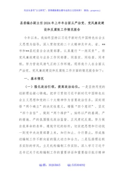 / 县委编办副主任2024年上半年全面从严治党、党风廉政建设和反腐败工作情况报告