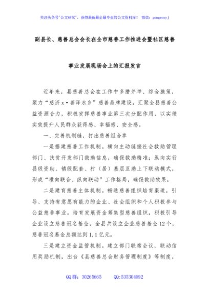 / 副县长、慈善总会会长在全市慈善工作推进会暨社区慈善事业发展现场会上的汇报发言