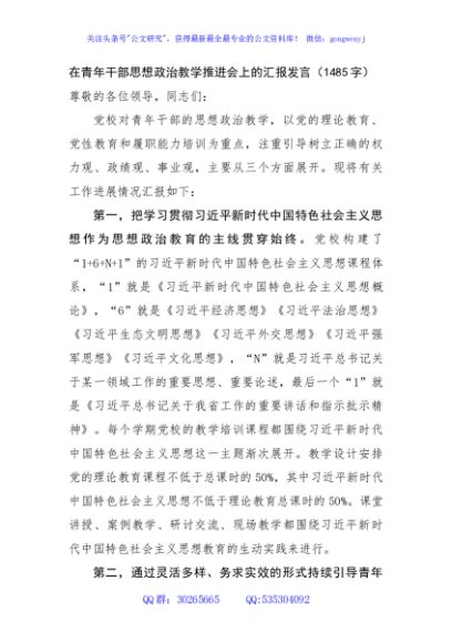 / 在青年干部思想政治教学推进会上的汇报发言(1485字)