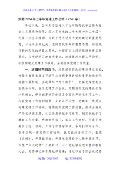 / 国企2024年上半年党建工作总结(2243字)