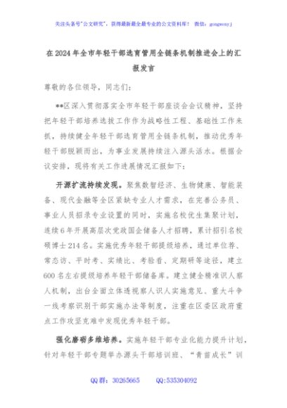 / 在2024年全市年轻干部选育管用全链条机制推进会上的汇报发言
