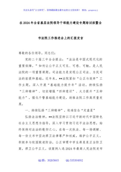 / 在2024年全省基层法院领导干部能力建设专题培训班暨全市法院工作推进会上的汇报发言
