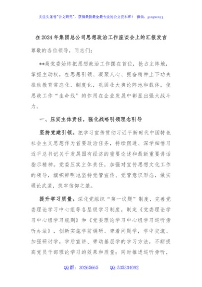 / 在2024年集团总公司思想政治工作座谈会上的汇报发言