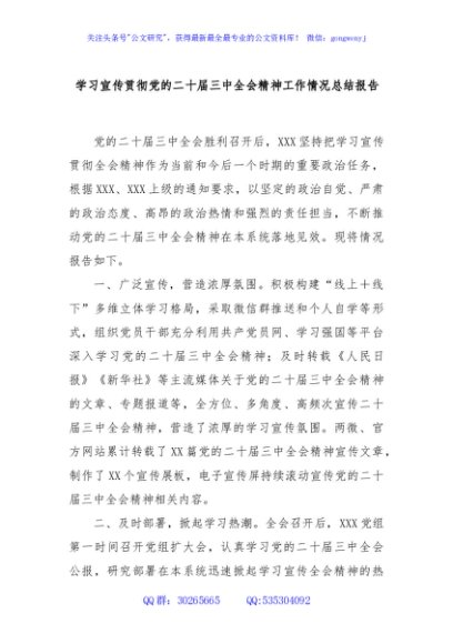 / 学习宣传贯彻党的二十届三中全会精神工作情况总结报告
