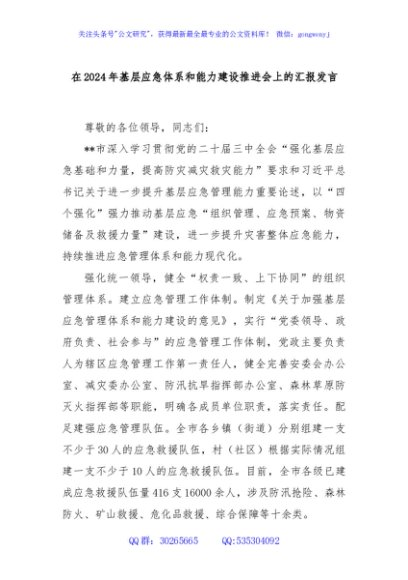 / 在2024年基层应急体系和能力建设推进会上的汇报发言