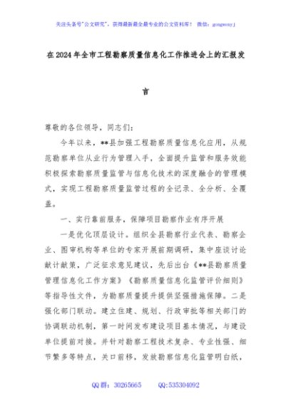 / 在2024年全市工程勘察质量信息化工作推进会上的汇报发言