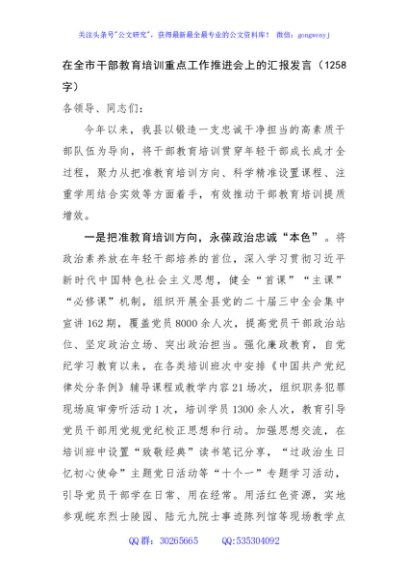 / 在全市干部教育培训重点工作推进会上的汇报发言(1258字)