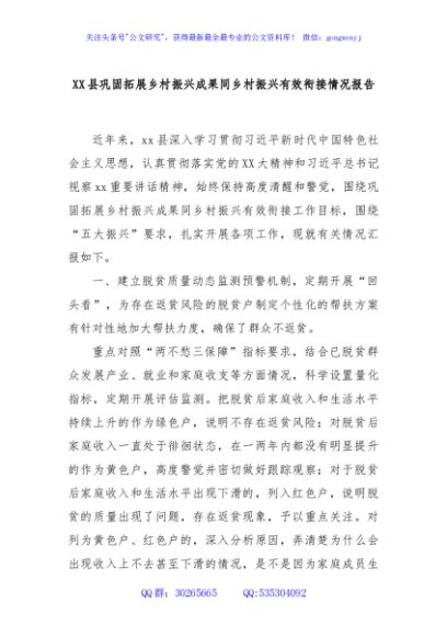 / XX县巩固拓展乡村振兴成果同乡村振兴有效衔接情况报告