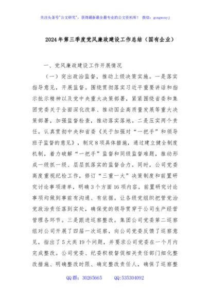 / 2024年第三季度党风廉政建设工作总结(国有企业)