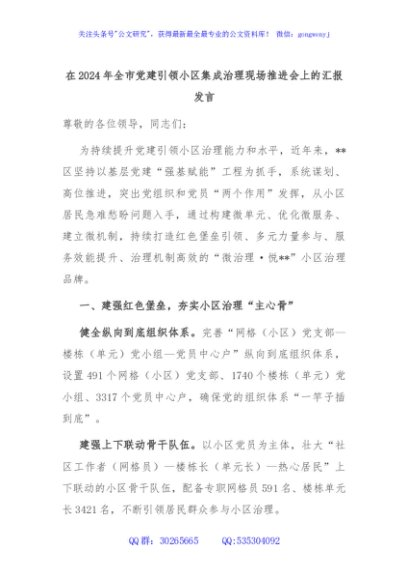 / 在2024年全市党建引领小区集成治理现场推进会上的汇报发言