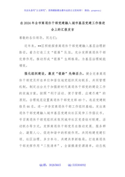 / 在2024年全市离退休干部党建融入城市基层党建工作推进会上的汇报发言