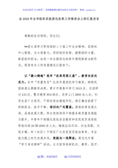 / 在2024年全市组织系统深化改革工作推进会上的汇报发言