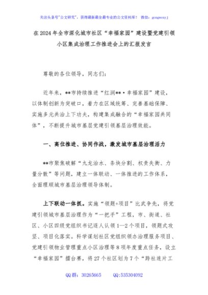 / 在2024年全市深化城市社区“幸福家园”建设暨党建引领小区集成治理工作推进会上的汇报发言
