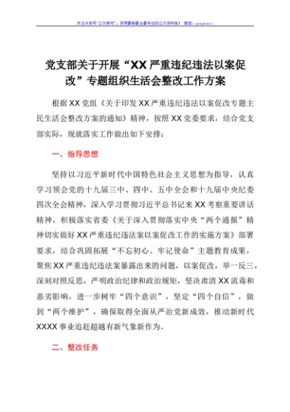 党支部关于开展“XX严重违纪违法以案促改”专题组织生活会整改工作方案